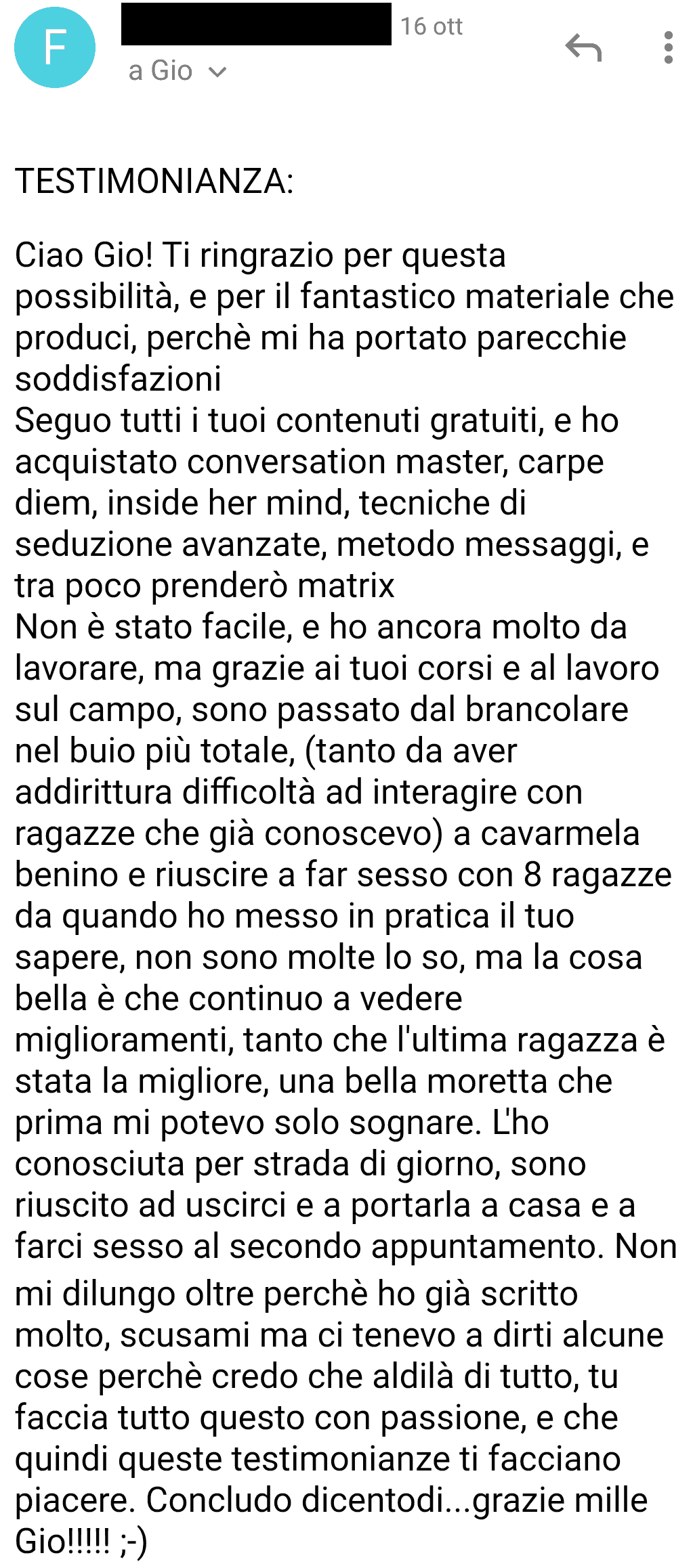 [...] Consiglio a tutti di comprare l'e-book "Conoscere donne". L'ho trovato molto utile e molto pratico.In pochi giorni ho conosciuto tante ragazze. non quelle carine, ma quelle B-E-L-L-E, (ho approcciato con la più carina del mio corso!, talmente bella che nessuno ci provava o lo faceva in modo ridicolo) E vorrei sottolineare che questo metodo è NATURALE e quindi non si tratta solo di un insieme di tecniche efficaci da seguire, ma spiega, in modo semplice e lineare, come ci si deve rapportare con le ragazze durante l'approccio. [...] E' un ottimo investimento. Perchè ci permette di conoscere le ragazze con cui non abbiamo mai osato provarci alimentando la nostra autostima, dandoci serenità